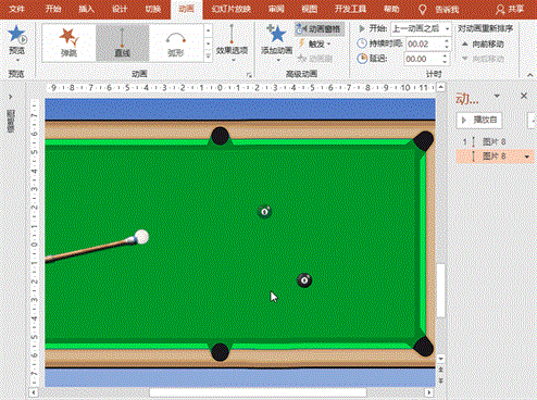 (2)球杆推进动画:“动画”菜单-“添加动画”-“动作路径”之“直线”,拖动推进的起止位置,使终点位于白球边缘,设置平滑开始、平滑结束均为0,添加单击声音,设置开始为“上一动画之后”、延迟为“0”、持续时间“0.02秒”;