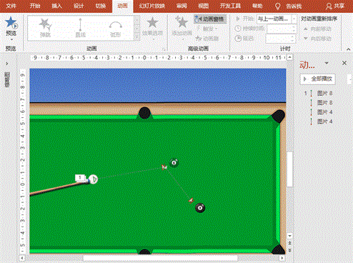 (8) 黑球被白球撞击后滚动动画:“动画”菜单-“添加动画”-“动作路径”之“直线”,拖动起止位置,使终点位于球洞中,设置平滑开始、平滑结束均为0,添加单击声音,设置开始为“与上一动画同时”、延迟为“0.3”、持续时间“0.6秒”;