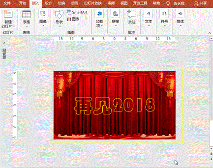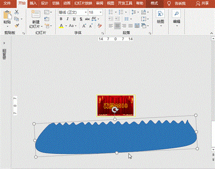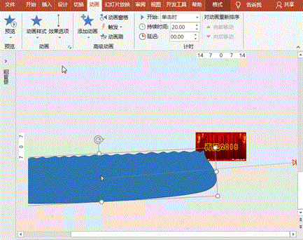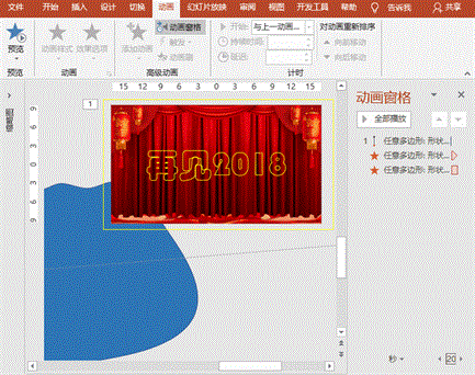 (1)潮起波浪动画:放缩、旋转波浪形状,并可右键“编辑顶点”调整后,执行“动画”菜单-“添加动画”-“动作路径”之“直线”,设置起始点分别为“告别2018”文字的左下方和右上方、开始为“单击时”、持续时间20秒、延迟0秒;