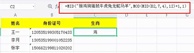在C2单元格中输入公式:=MID(“猴鸡狗猪鼠牛虎兔龙蛇马羊”,MOD(MID(B2,7,4),12)+1,1),回车即可