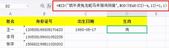 最佳答案方法一、提取日期后再生成生肖操作步骤:1、在C2单元格中输入公式:=TEXT(MID(B2,7,8),”0-00-00″),提取到出生日期;2、然后在D2单元格中输入公式:=MID(“鼠牛虎兔龙蛇马羊猴鸡狗猪”,MOD(YEAR(C2)-4,12)+1......