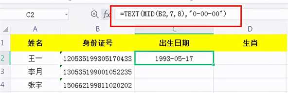 1、在C2单元格中输入公式:=TEXT(MID(B2,7,8),”0-00-00″),提取到出生日期;