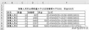 使用IF和AND,计算销售人员是否有资格获得奖金。