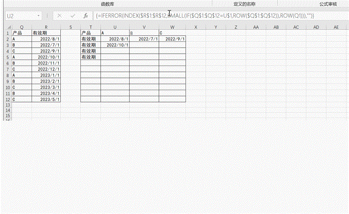 最佳答案以下面的例子为例,一个产品有不同的有效期,我需要查找出来并放在对应的产品下面,这个时候就需要用到index+small+if的结合。公式:=IFERROR(INDEX($R$1:$R$12,SMALL(IF($Q$1:$Q$12=U$1,ROW($Q$1:$Q$12)),ROW(Q1))),R......