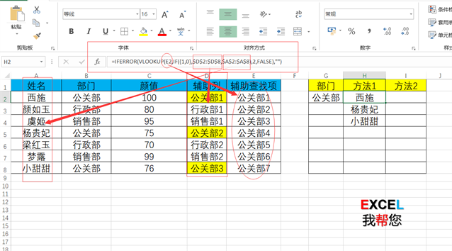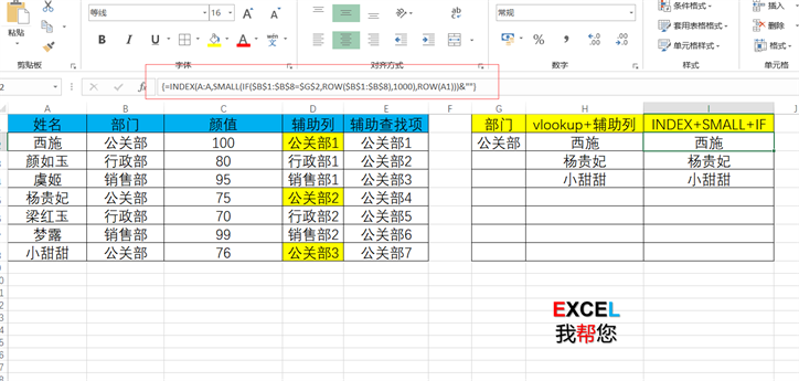 我们知道vlookup函数只能进行一对一查询,但是换个角度,我们在D列输入函数=B2&COUNTIF($B$2:$B2,B2)这样就建立了一个一一对应不重复的辅助列,比如公关部1对应西施,公关部2对应杨贵妃,公关部3对应小甜甜