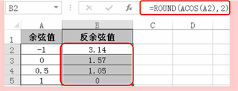 使用ACOS函数可以计算出数值的反余弦值,本例中可以配合前面实例介绍的ROUND函数将结果保留两位小数位数。
