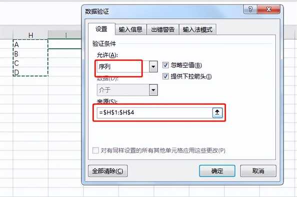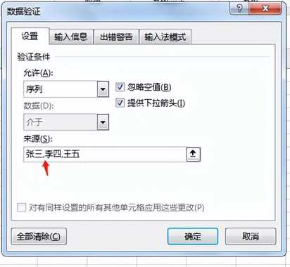 2、在允许选项卡内选择序列按钮,来选直接选择我们事先设置好的数据,最终点击确定即可