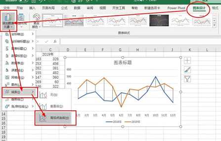 首先插入折线图 – 图表设计 – 添加图表元素 – 线条 – 高低点连线