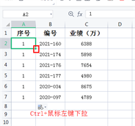 ②如果序号都是相同的数字,例如1。只需要在第一个单元格内输入数字1,然后按住【Ctrl】键在按单元格右下角的填充柄向下拖动