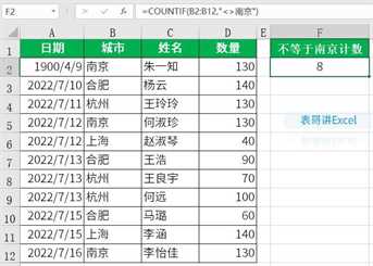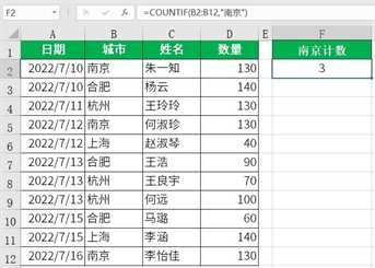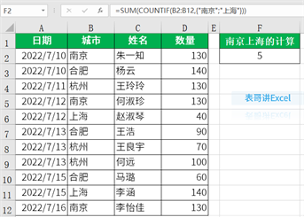 =SUM(COUNTIF(B2:B12,{“南京”;”上海”}))