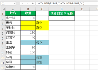=COUNTIF(B2:B12,””)-COUNTIF(B2:B12,”=”)
