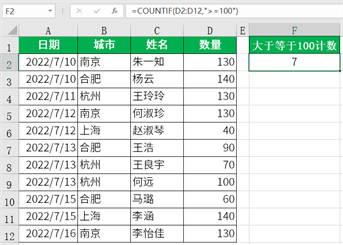 但是不能这样写公式:=COUNTIF({96;95;95;101;98;101;99;95;98;96},100)