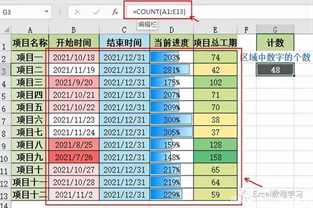 如要计算表格区域中A1:E13带有数字单元格的个数,通过count函数直接进行计算,结果为48。因为在excel中,日期格式的时间和百分比数字,都属于数值,因此会被系统认定为数字单元格。