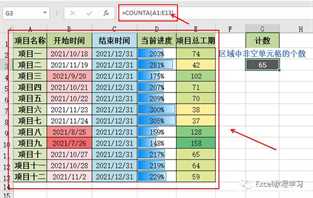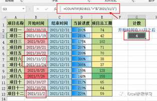 如下图所示,要计算区域中开始时间在11月以后的单元格个数。