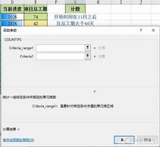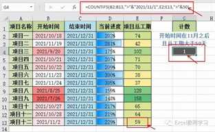 如在下图中需要计算开始时间在11月以后,且工期大于50天,符合这两个条件的单元格个数。