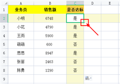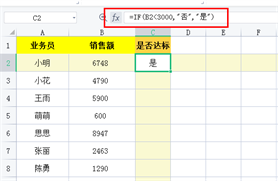 表格中经常会需要根据数值的大小,返回不同的结果。如下图中,某公司业务员业绩需要判断,大于3000为合格,小于3000显示为不合格。这个过程就是【条件判断】,即可用IF函数来完成。