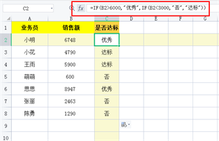 在C2单元格中输入函数公式【=IF(B2>6000,”优秀”,IF(B2<3000,”否”,”达标”))】