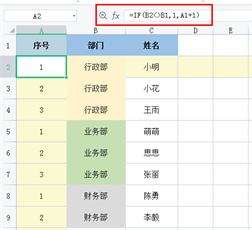 如下图所示,根据B列单元格的各个部门名称,在A列单元格中按照部门生成相应序号。
