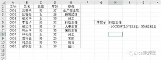 公 式:=LOOKUP(1,0/(B2:B11=G5),E2:E11)套用结构:=lookup(1,0/(查找值=查找列),结果列)