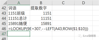 公 式:=LOOKUP(9E+307,–LEFT(A43,ROW($1:$10)))套用结构:=lookup(9E+307,left(查找值,row(1:最大数字是几位))*1)
