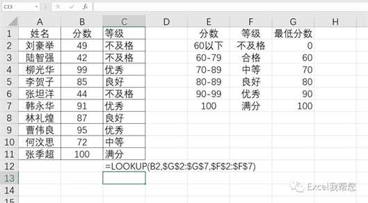 公 式:=LOOKUP(B2,$G$2:$G$7,$F$2:$F$7)套用结构:=lookup(查找值,查找列,结果列)