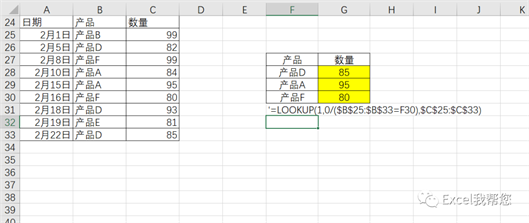 公 式:=LOOKUP(1,0/($B$25:$B$33=F28),$C$25:$C$33)套用结构:=lookup(1,0/(查找值=查找列),结果列)注 意:日期必须是升序结构哦
