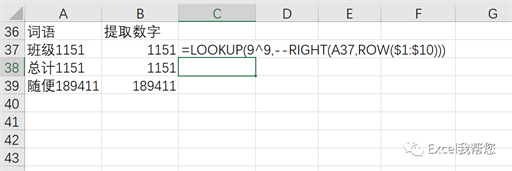 公 式:=LOOKUP(9^9,–RIGHT(A37,ROW($1:$10)))套用结构:=lookup(9^9,right(查找值,row(1:最大数字是几位))*1)注 意:9^9也可以用9e+307,代表一个很大的数