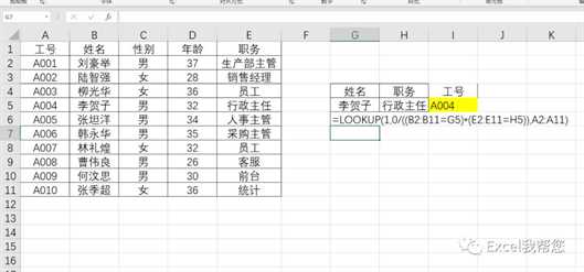 公式:=LOOKUP(1,0/((B2:B11=G5)*(E2:E11=H5)),A2:A11)套用结构:=lookup(1,0/(条件1=查找列1)*(条件2=查找列2),结果列)