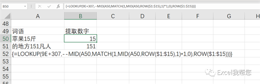 公式:{=LOOKUP(9E+307,–MID(A50,MATCH(1,MID(A50,ROW($1:$15),1)*1,0),ROW($1:$15)))}1、 mid函数进行一个数据的提取,2、 利用match查找到第一个数字开始的位数,然后开始提取。3、 LOOKUP的提取套路:=lookup(9E+307,….)4、 数组公式,CTRL SHIFT ENTE结束公式