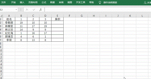 如图,需要将多个单元格进行乘积计算,可以直接输入公式=PRODUCT(B2:D2)