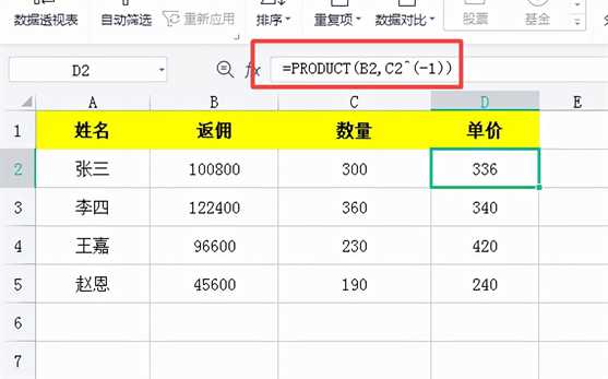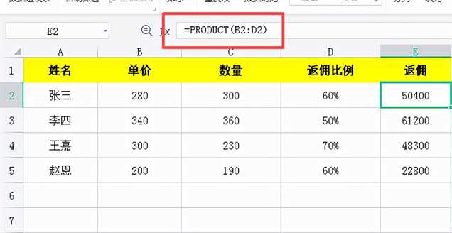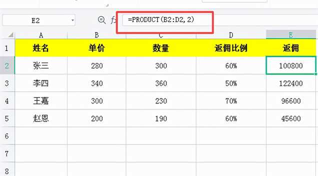延伸:如果想将得到的返佣金额再乘以2,这时可以在单元格中输入公式:=PRODUCT(B2:D2,2)。等同于计算单元格B2至D2中数字的乘积,然后再将结果乘以2.