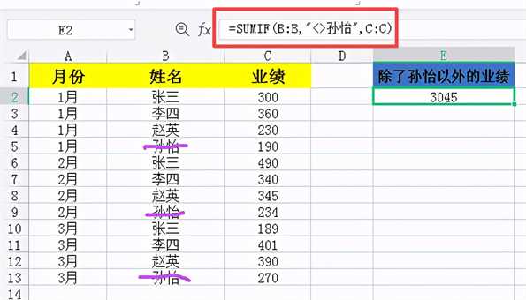 =SUMIF(B:B,”<>孙怡”,C:C)