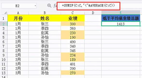 =SUMIF(C:C,”<“&AVERAGE(C:C))