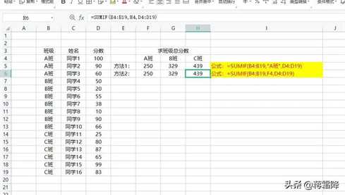 同样:依次类推,在G6单元格输入公式:“=SUMIF(B4:B19,G4,D4:D19)”,计算B班总分数,在H6单元格输入公式:“=SUMIF(B4:B19,H4,D4:D19)”,计算C班的总分数,和方法1运算结果相同,如下图: