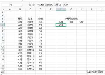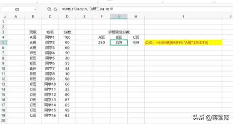 依次类推,在G5单元格输入公式:“=SUMIF(B4:B19,”B班”,D4:D19)”,计算B班总分数,在H5单元格输入公式:“=SUMIF(B4:B19,”C班”,D4:D19)”,计算C班的总分数。如下图:
