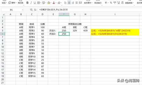 方法2:光标移到F6单元格,如图,输入公式“=SUMIF(B4:B19,F4,D4:D19)”,计算得出:250分,和方法1的结果一样。
