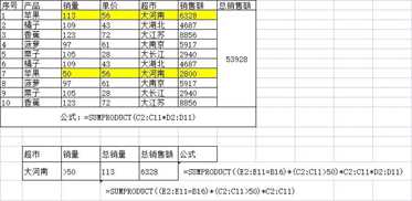 在目标单元格中输入公式: 总销量=SUMPRODUCT((E2:E11=B16)*(C2:C11>50)*C2:C11)、总销售额=SUMPRODUCT((E2:E11=B16)*(C2:C11>50)*C2:C11*D2:D11)