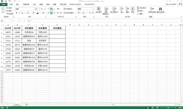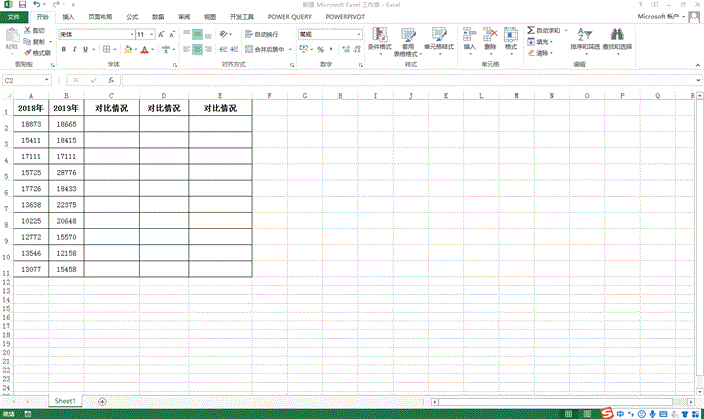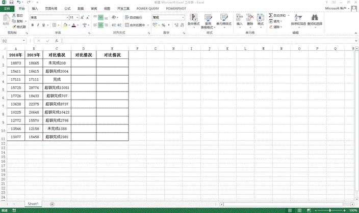 表格中准备了2018年和2019年的数据,我们需要将两列数据进行对比,并用指定的字段表示出来: