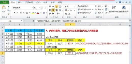 案例说明:公司有相同姓名人员时,根据工号、姓名多个条件查询人员的销售额。