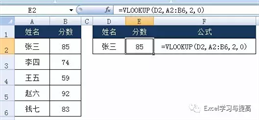 E2单元格中的公式是“=VLOOKUP(D2,A2:B6,2,0)”