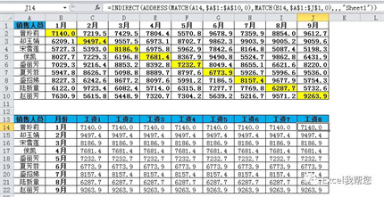 注:用MATCH函数根据给出的姓名和月份查找行、列数,然后用ADDRESS(行数,列数,绝对引用方式,是否是R1C1,工作表名称)组合成引用地址,然后用INDIRECT(单元格地址)函数提取值。
