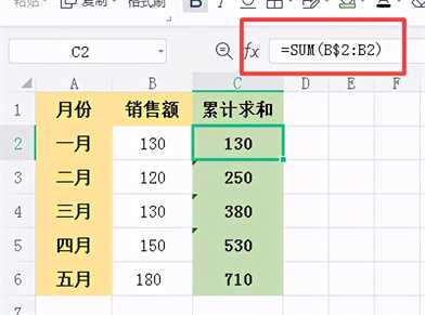 如图所示,C2单元格输入公式【=SUM(B$2:B2)】.其中,参数B1=2绝对引用,B2是相对引用。