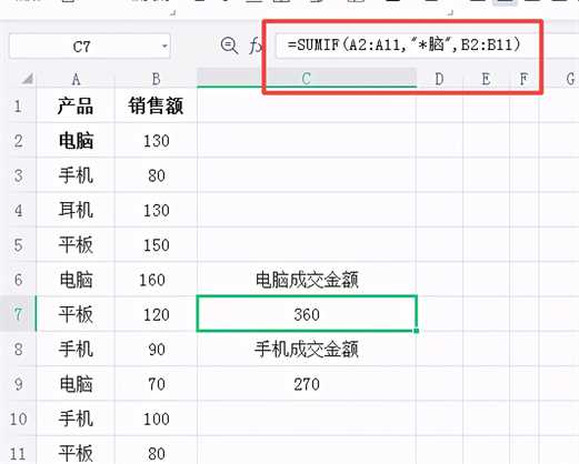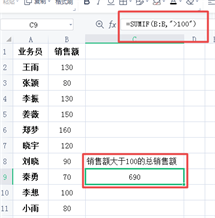 如下图,统计销售额大于100的总销售额。这时候我们可以用SUMIF函数来计算
