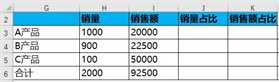 计算公司各产品的销量占比、销售额占比;产品销量占比=该产品销量÷总销量,数据如下: