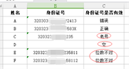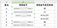 小编研究了一下,这个判断方法不错,缺点是公式太长,而且小编发现这个公式存在局限性。如上图,姓名E的身份证号写成了19位(中间多出一个数),这个公式会判定它是错的,而当姓名F的身份证号写成了19位(最后多出了一个数),这个公式却依旧判定它是对的;并且当身份证号为空或者位数不对时,这个公式也只是显示计算错误“#VALUE!”,而无法得知错在哪儿。