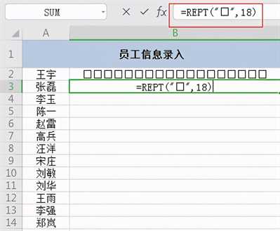 REPT函数可以重复显示某个文本信息;双引号内的“□”需要用“搜狗输入法”输入“正方形”,选择第五个就可以打出来;“18”表示□会重复出现18次。