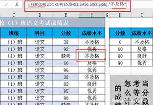 在这里,作者直接给之前的公式套上iferror的“外衣”,完整公式为:=IFERROR(LOOKUP(E5,$H$3:$H$6,$I$3:$I$6),”不及格”)