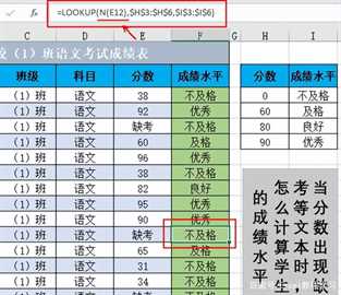 怎么理解呢?这列E12单元格是“缺考”,所以N(E12)的结果是0,而lookup函数的第一个参数查找值为0,它匹配的结果是分数段0对应的“不及格”。