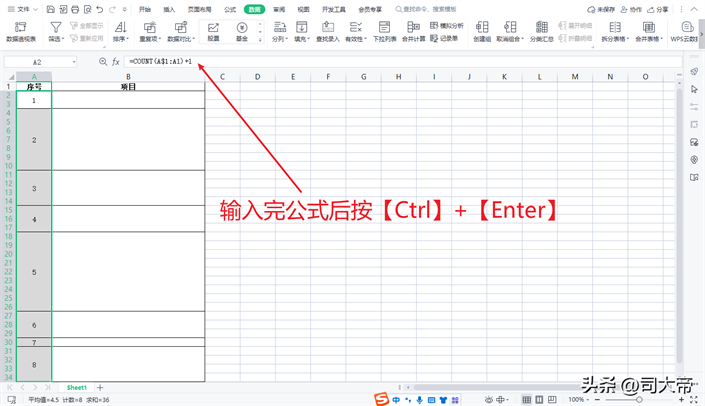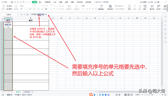 一、先一次性选中需要填充序号的空白单元格二、接着输入公式:=COUNT($A$1:A1) 1