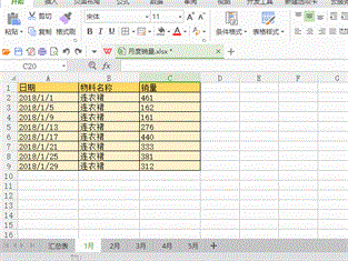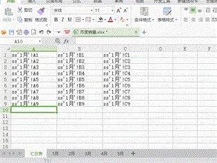 步骤1:新建一个空白工作表,在第一个单元格输入“=1月工作表单元格A1”,然后向右拖动获取1月工作表中第一行的数据,接着将公式中的“=”号修改成“ss”,然后向下填充到第9行(1月工作表有9行数据)。